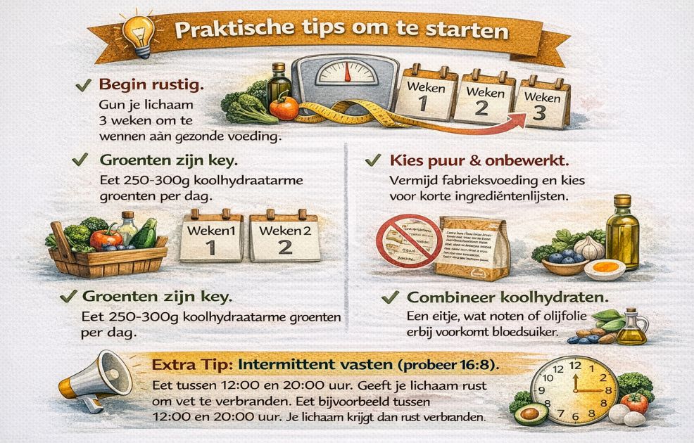 Mijn belangrijkste advies: begin niet te fanatiek. Gun je lichaam 3 weken om te wennen aan gezonde, verzadigende voeding. Dat is de basis.