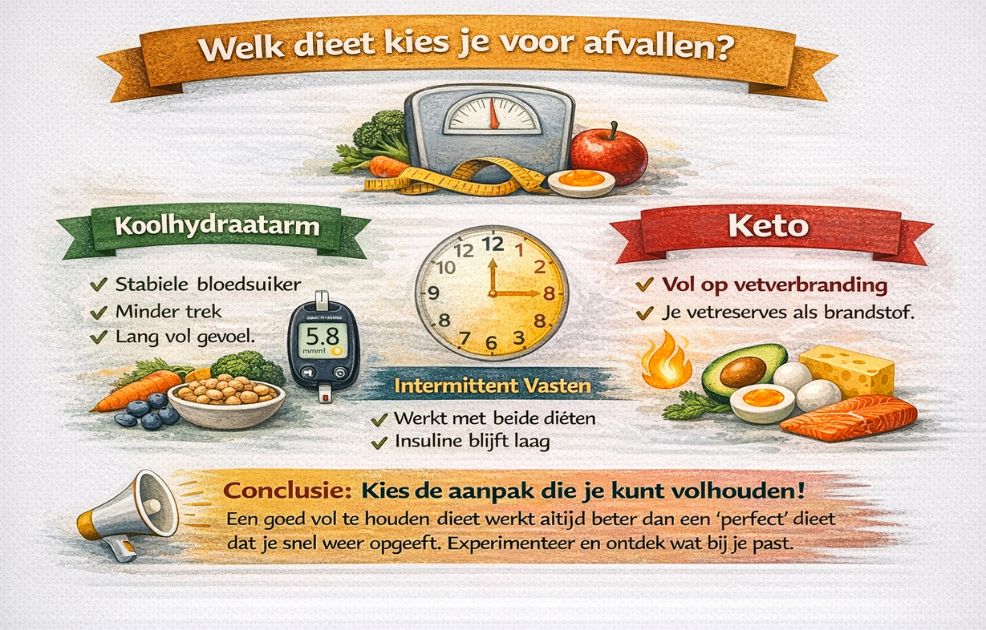 Het verschil tussen koolhydraatarm en keto komt neer op de mate van beperking. Koolhydraatarm geeft je meer flexibiliteit met 50-150 gram koolhydraten per dag, terwijl keto veel strikter is en je lichaam in ketose brengt. Beide aanpakken kunnen je bloedsuiker stabiliseren en helpen bij afvallen, maar werken via andere mechanismen.