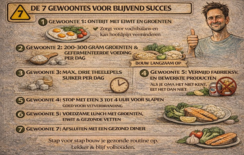 Het geheim van blijvend succes zit niet in een streng dieet dat je drie maanden volhoudt. Het zit in gewoontes die je de rest van je leven kunt doen. Hier zijn de zeven die voor mij werken.