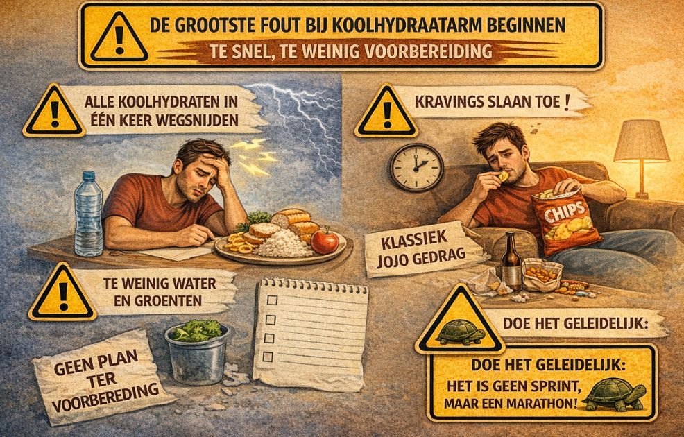 Ik heb deze fout zelf gemaakt, dus ik kan erover meepraten. Op een maandagochtend besloot ik: vanaf nu geen koolhydraten meer. Brood weg, pasta weg, rijst weg, aardappelen weg. Alles in één keer. Grote fout.